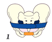 image050 3-1(妊娠中) 重い胎児が下がって内臓が下に押し込まれないように、恥骨から後ろに回す力を下と同じに強めに巻き、胎児を支えるバンドも強く巻きます。背中はやや高めの位置を通します。3-2(出産後) 上を締めすぎると、下の恥骨結節が開いてしまうので、恥骨から後ろに回す力は骨盤を整える程度に軽く巻きます。